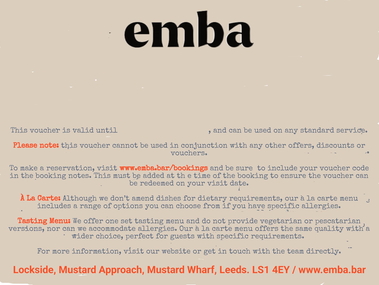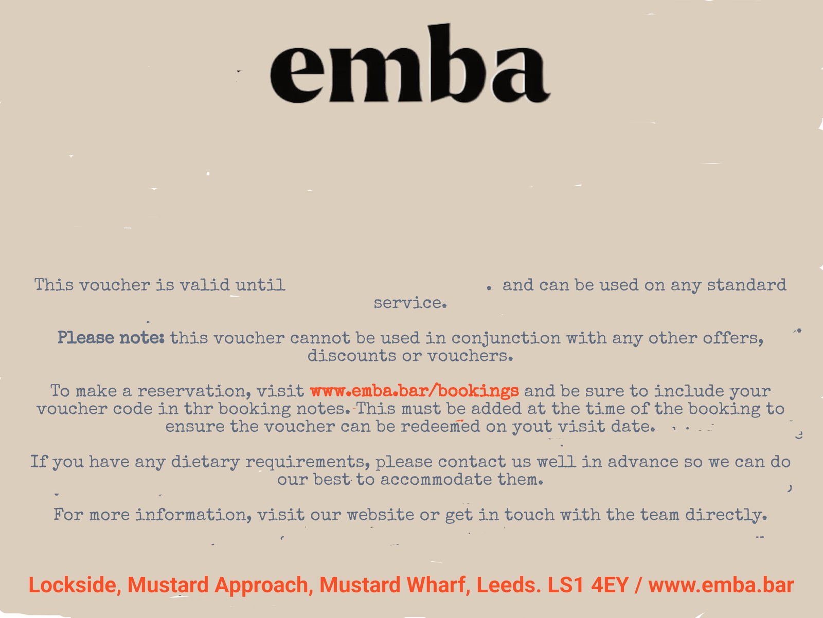 Digital Vouchers can be redeemed against food and beverages during a single visit to emba.
